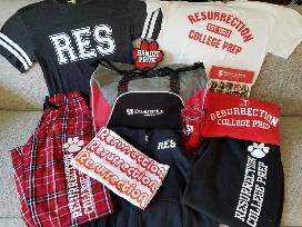 Be ready to cheer with this spirit wear from Resurrection College Prep High School, including: gym bag, plaid flannel pajama pants (small); long sleeve, red t-shirt (medium); black, zip-front hoodie (medium); white, retro font t-shirt (medium); white t-shirt (medium); black sweatpants (large); charcoal Gray "RES" t-shirt (medium); red tumbler with straw; and Bandit Pride car magnet. Go Bandits!