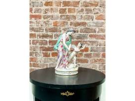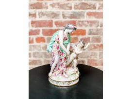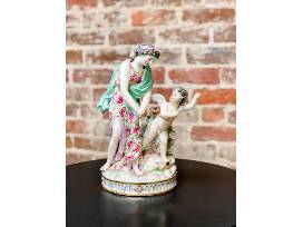 Meissen porcelain group with a figure of a lady in a long dress with a light green shawl and a cherub standing next to her, c. 1900, 12" H