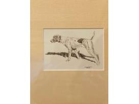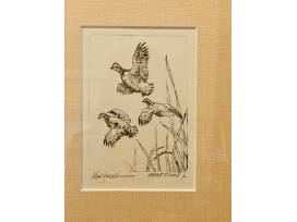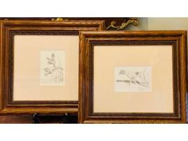 Pair of framed sketches by Homewood, AL artist Kevin Webster. Featuring game birds in one and a bird dog in the ither.