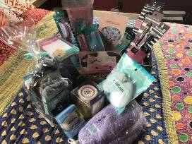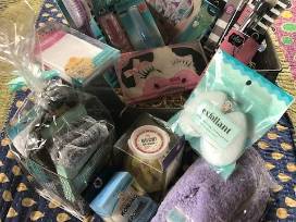 Spa Sisters Makeup brushes, Eyelash curler, Shower cap, Slippers, Pedicure tools, Face and body sponges, Sleep mask, and more.