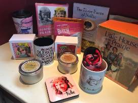 The Three Faces of Nellie softcover book, Little House on the Prairie Complete Series DVD Collection, Confessions of a Prairie Bitch hardcover book, Confessions of a Prairie Bitch Audio CD, Nellie Oleson Tote Bag, Nellie Oleson Drink Coasters, Oleson's Mercantile Coffee Mug, Nellie Oleson Socks, Nellie Oleson Water Bottle and Alison Arngrim Candle Collection with Warm Cookie and Hot Orange Tart scented candles.