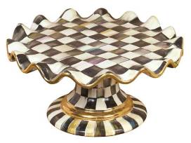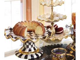 Covered in cupcakes for your princess's party or scones and biscotti for your morning coffee club, the Courtly Check Fluted Cake Stand stands alone as a delightful piece of serving ware. Crafted of clay and painted by hand on the Mackenzie Childs farm in Aurora, NY, this piece is sure to be as delicious as the treats it presents. A beautiful juxtaposition of ivory and onyx, the deceptively simple signature checks reveal an intricate spectrum of jewel-toned colors. Handmade, fired, glazed, fired again, hand-painted, fired again, and embellished with lustre, each piece is stamped by the artisans involved in its creation.