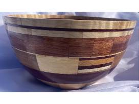 This gorgeous, hand-made bowl is constructed and crafted of some ordinary and some exotic woods. It can be used as a decorative piece and/or to hold fruit and dry goods. It is not coated with a food grade finish, but instead is covered with a polyurethane that helps keep it relatively scratch and stain free.