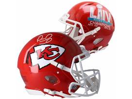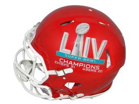 Celebrate the Kansas City Chiefs' historic victory in Super Bowl LIV with a commemorative, limited-edition, autographed helmet by Super Bowl LIV MVP, Patrick Mahomes. This helmet features the Chiefs logo on one side, with the Super Bowl LIV logo on the other, along with the final score of the game between the Kansas City Chiefs and the San Franscisco 49ers.