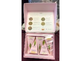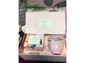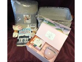 Canvas "love" print basket 11"x15", filled with items for a cozy time: 2 sets soft socks; teapot and herbal teas, book & Moland fleece throw