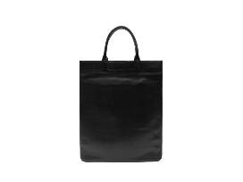 Buffed leather tote in black. Twin carry handles at top. Logo gold embossed at face-magnetic press-stud fastening at top.