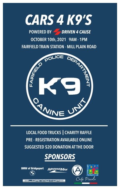 Driven 4 Cause is hosting Cars 4 K9s on Sunday, October 10th to support the Fairfield Police K9 Unit. This event is in collaboration with The Hometown Foundation, BMW of Bridgeport, Automobilia, Sloan Motorcars, Marine Max and Cafe Piccolo. Car enthusiasts will enjoy a day of classic and performance cars, a live K-9 demonstration, local food trucks, a charity raffle, music and fun for the whole family!