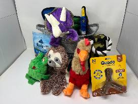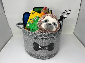 Your favorite furry friend will love this basket filled with tons of dog toys and a few treats, too!