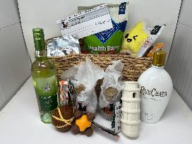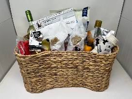 Cute bone-shaped wicker basket full of what dogs love (& something for you too!):