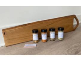 Get your holiday party musts: A handmade serving/cutting board made with Live Edge Chestnut from Europe with four jars of award winning Southpaw Seasonings. Perfect for an event, or just to add some beauty into your home!