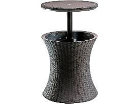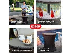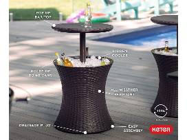 Keter Pacific Cool Pop Up Bar and Cooler. Lid elevates upwards 10 inches above the rim for use as a patio bar table. The top reveals a hidden cooler with 7.5-gallon capacity. Keep up to forty 12 oz. cans ice cold. When not being used as a party bar, shut the top and use as a patio coffee table. When elevated, it is the ideal height for use as a hot tub table so you will always have a spot for your drink, snacks, and phone.