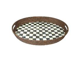 The Courtly Check Rattan and Enamel Party Tray (19 1/2" x 25 1/2" x 3") features an invigorating juxtaposition of woven natural rattan against royal checks handpainted onto a sturdy steel base. This entertaining tray would make a great housewarming gift and is perfect for year-round use, indoors and out.