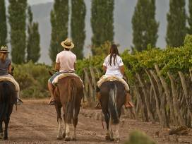 Nestled in a 55-acre vineyard, Cavas Wine Lodge is strategically placed between the best-known Argentinian wineries and the magnificent Andes Mountain range. Two couples will enjoy this beautiful resort located just 30 minutes from Mendoza in the heart of Argentina's wine country. With over 900 wineries positioned throughout the foothills of the Andes, the wine route that runs through Mendoza is one of the most charming, variety-rich, and visually stunning in the world. At the foot of the Andes, Cecilia Diaz Chuit and Martin Rial have created a splendid hotel, built in Spanish colonial style, and devoted to the joys of wine.