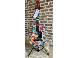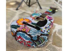 This 35-inch decorative mini guitar will jazz up any creative space! This piece is inspired by Saint Thomas where artist Gina Massey grew up. Designs on the guitar include an iguana, shells, scenes of the beach, ocean waves and hibiscus flowers. This guitar is for decorative use only and is not intended to be a playable instrument.