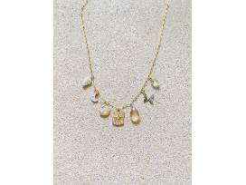 Multi charm Heart and Star necklace. Clear quartz, smoky topaz, keishi, diamond butterfly and coin pearl on 14kt gold filled necklace.