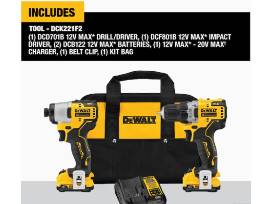 The DCK221F2 12V MAX lithium ion Brushless drill and impact driver kit is compact and performance packed. The DCD701 drill is designed for precision applications and great for applications like small pilot holes, but also can handle up to a 1/2-in spade bit. Small enough to fit in the tightest places at only 5.97-in long and enough power to get the job done with 250 UWO and a 2 speed transmission. The DCF801 impact driver is designed for precision applications and great for applications like small fasteners, but also can handle up to a 1/4-in lag bolt. Small enough to fit in the tightest places at only 5.05-in long and enough power to get the job done with 1,450 in-lbs of torque and 3 LEDs positioned on the nosecone to illuminate all work areas.