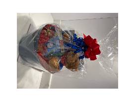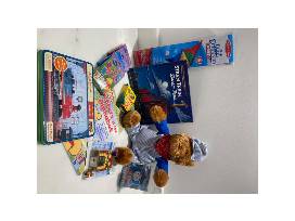 The All Aboard! gift basket contains: Engineer Bear Steam Train, Dream Train book Train Night Light Thomas theTrain All Aboard Card Game All Aboard! Magnetic Build-it Melissa and Doug Kite 3 Winnie the Pooh Card Games Coloring Book Crayons.