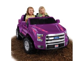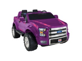 Power Wheels Ford F-150 is designed to perform in the toughest backyard driving conditions including wet grass, mud and more. Featuring super-cool camo graphics, plus a real FM radio, roomy truck bed with working lift-and-lower tailgate, pretend seat belts--and it fits two riders! Drives 2 speeds forward (2.5 and 5 mph max.), plus reverse, on grass, hard surfaces and rough terrain. Equipped with high speed lock-out for beginners and Power-Lock brakes.