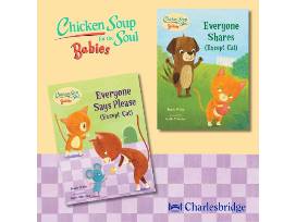 Image: Two books covers: EVERYONE SHARES (EXCEPT CAT) and EVERYONE SAYS PLEASE (EXCEPT CAT), along with the heading: Chicken Soup for the Babies Soul, and the text "Charlesbridge Publishing" on the bottom.