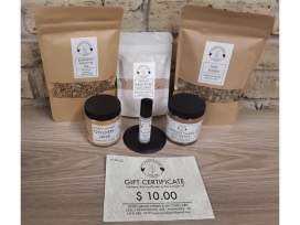 Golden Milk "Immune Gold", Chipotle Chaga Cocoa Mix, Kava Rose Coconut bath salts, Thieves Roll on, two varieties of loose tea and a $10 gift card.
