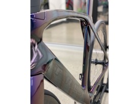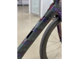 Artist Jeremy Espersen loves snakes, and incorporated them into this 'must see to believe' one of a kind hand painted 56cm Madone frame. Jeremy airbrushed every scale on two intertwining snakes, as they wrapped themselves around this frame with a subtle purple to blue flip background. In the Sun this bike shimmers, and at night when lights hits it, you will be seen!'