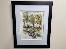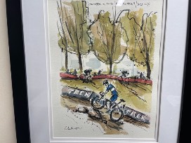 This Original Watercolor was created at the UCI Cylo-Cross World Cup in Waterloo on October 10, 2021. The piece is 12x16, framed to 14x18.