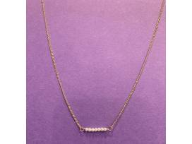 This dainty gold chained necklace boasts 7 mini pearls on a 16" cable chain with lobster clasp. A beautiful addition to your everyday jewelry wardrobe.