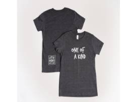 - "One of a Kind" crew: Grey, medium size youth tee; white text on front reads "One of a Kind", reverse at hem "Little Rebels with a Cause"