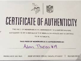 This is an authenticated Vikings Football signed by #19 Adam Thielen, an American football wide receiver for the Minnesota Vikings of the National Football League.