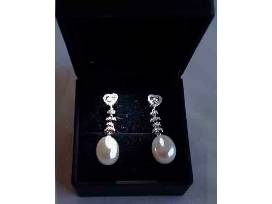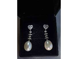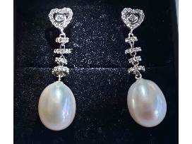 This unique and beautiful pair of elegant dangling earrings are set with diamonds and oval freshwater pearls.