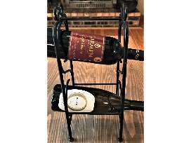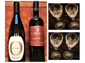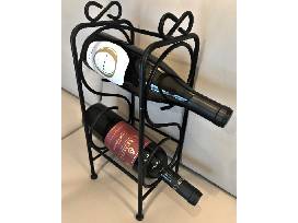 Two Quality Wines, Two-Tier Wine Rack, and Set of Four Crystal 8 oz Wine Glasses