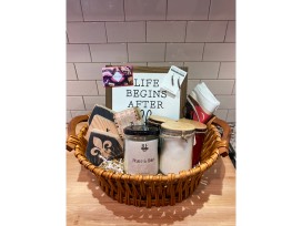- RF Home Company Basket Containing Peace & Quiet Candle, Wood Sign "Life Begins After Coffee", St. Louis Flour Sack Towel, Made by Maggie Leaf Earrings, St. Louis themed Wood Block Stack, I Love St. Louis Sticker, $25 gift card to RF Home Company