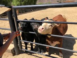 The baby donkeys may be milling about while you eat. The ranch has almost every farmed animal and each has a story about its rescue including: fish, cows, bulls, farm pigs, pygmy goats, pot-bellied pigs, turkeys, roosters, chickens, donkeys, horses and lambs.