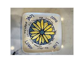 Our small friends in Mrs. Castellano's class have painted this beautiful "Learn, Love, Serve, Live" plate. It is beautifully decorated with Canterbury's rose window surrounded by the names of the sweet cougars in Mrs. Castellano's class.