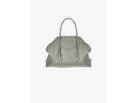 Medium Antigona Soft bag in soft pearl gray leather, with triangular GIVENCHY patch, dark silver-finish metal details and leather side bands with a twist clasp. Removable shoulder strap. One main compartment, one flat pocket, and one pocket for business cards on the inside.