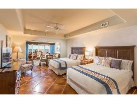 Details of the Suite: 1,255 square foot Presidential Suite (Garden) (Ocean view based on availability upon check-in) featuring two bedrooms (main bedroom King size bed, guest bedroom 2 Queen size beds), three bathrooms, fully equipped kitchen, dining table for six and private balcony or terrace lush surroundings and stunning garden views. Hacienda Del Mar Los Cabos Resort Villas & Golf is a AAA Four Diamond Resort. Your presidential suite features a private Jacuzzi tub, Sweet Sleeper mattresses and down bedding, daily housekeeping and 24-hour room service.