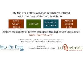 I.D. Retreats are the specifically outdoor retreats that are offered through Into the Deep. Infusing outdoor adventures with Theology of the Body insight, I.D. Retreats bring the unique mission and vision of Into the Deep out to a setting we were made for.