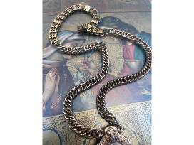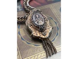 "I created this antique assemblage by prong setting an antique medal of the Sacred Heart of Jesus into an antique pendant with chain tassels. The heavy curb chain is original to the pendant and is extended with an antique, openwork, brass, book-chain bracelet that has its original hook clasp. There's nothing else like this in the world, it's one-of-a-kind! When worn, the pendant sits "heart-center", exactly where Jesus should be!"