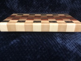 This beautifully crafted board made of maple, cherry, padauk, walnut and zebra wood would make a wonderful addition to any home. This is a one of a kind item you will enjoy for years to come.
