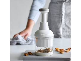 - Food Chopper - One of our most popular kitchen tools, the Food Chopper makes quick work of chopping veggies, cooked meat, and nuts in seconds. It's the solution to tear-free onion chopping! It's equipped with a unique stainless steel blade that rotates with each press of the plunger for consistent results. The more you press the plunger, the finer the chop.