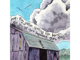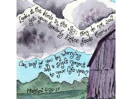 Watercolor print of Matthew 6: 26-27 verse, "Look at the birds in the sky; they do not sow or reap, they gather nothing into barns, yet your heavenly Father feeds them..."