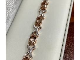 This piece consists of alternating oval faceted Morganites in four rose gold prongs, oriented east/west and rhodium plated, curved sided "X" links set with diamonds. The clasp is a rose gold tongue style with two figure eight safety clasps.