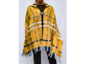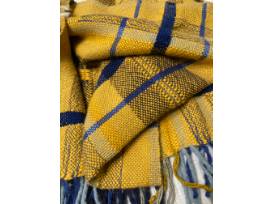 Bright yellow alpaca striped shawl with deflected double weave structure details. This wearable art piece has a beautiful soft drape, and is adorned with a removable Florentine Leather snap closure by JUL designs. This textile is woven with a combination of alpaca, cashmere, merino wool, bamboo, silk, and certified organic wool fibers. A versatile piece that can be worn as shawl.