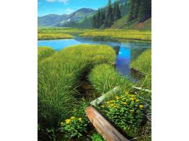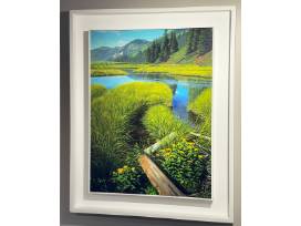 Canvas giclée of an original acrylic painting. The subject is Castle Creek near Aspen, Colorado. The white custom frame is included and made by the artist.