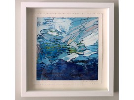 The painting is oil and cold wax on paper with a simple white frame. The artwork has hand-torn edges and is float-framed on an archival background.
