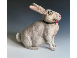 Ceramic sculpture with glaze, paint, and a glass eye.