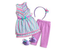Candy-striped dress with rickrack trim on the bodice and a bow at the waist. Includes a glittery headband decorated with ribbon and a rickrack flower, lilac leggings and glittery garden-clog shoes with ribbon bows.