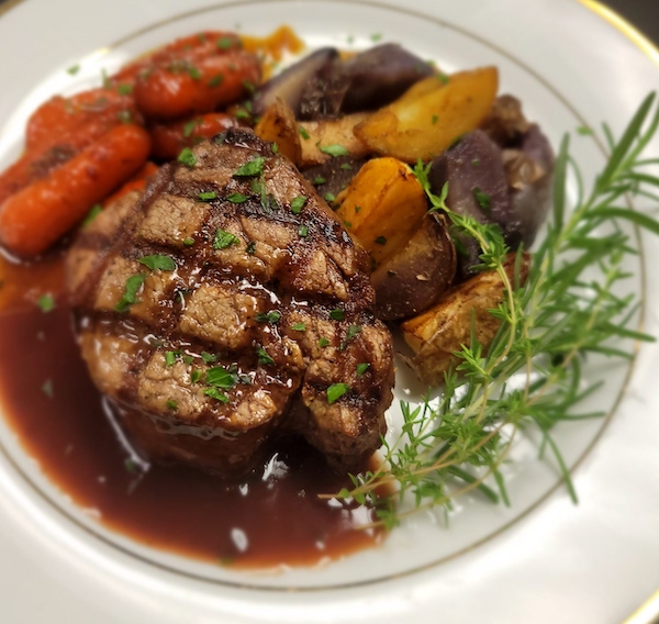 Grilled Filet Mignon with Cabernet Demi-glace, Tri Color Roasted Fingerling Potatoes,