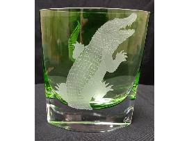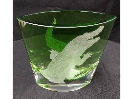 Wedge Crystal Vase from Evergreen Crystal with intricate, sand-carved alligator design. The multi-layered carving reaches a level of depth that accounts for its 3-dimensional detail. About 8" x 6"