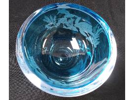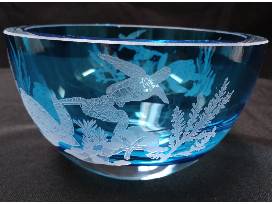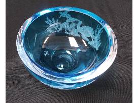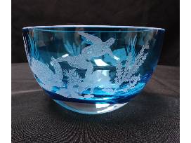 The Sea Turtle Scene Blue Crystal Bowl by Evergreen Crystal is a vibrant and intricately hand-carved glass bowl featuring an original undersea design. Multi-level deep sand carved design creates a 3 dimensional effect.